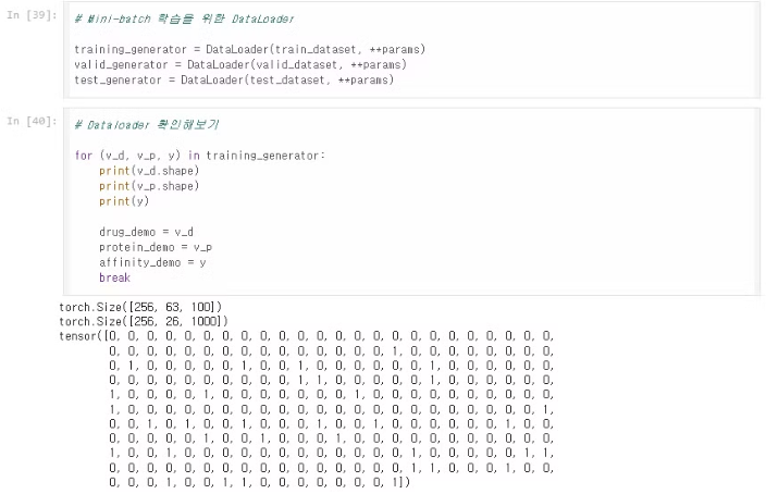 - 모델이 data를 꺼내서 처리하기 위한 함수로 주어진 인덱스에 해당하는 Drug와 Target(Protein), 그리고 그들의 Binding affinity(Label) 값을 반환한다.