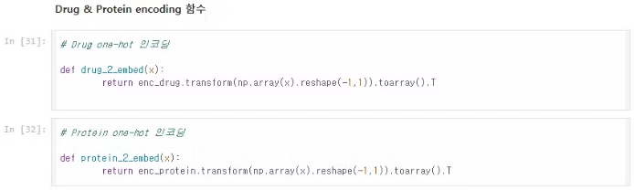 - drug_encoding과 target_encoding은 각각 SMILES와 Protein 시퀀스를 인코딩한 값으로, 이들을 각각 One-hot 인코딩으로 변환하는 drug_2_embed 및 protein_2_embed 함수를 사용하여 모델이 처리할 수 있는 형태로 만든다.