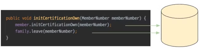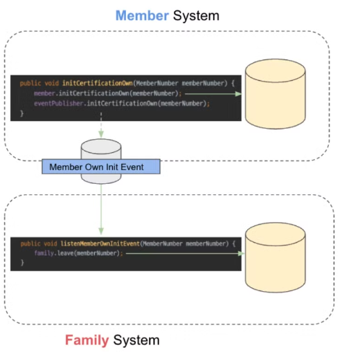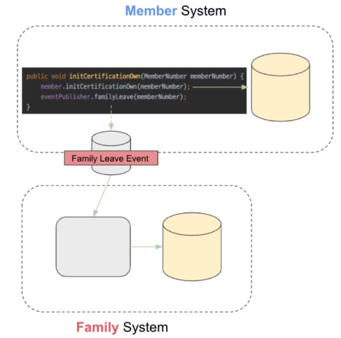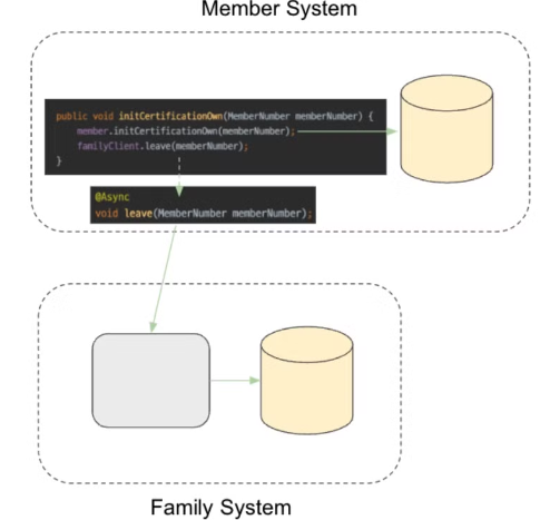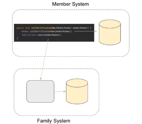 위 코드처럼 가족 계정 서비스 탈퇴 로직(family.leave())은 회원의 본인인증 해제 로직(member.initCertificationOwn())에 깊게 관여되어 강한 결합을 가지고 있다. MSA를 구성함에 따라 두 도메인은 서로 다른 시스템으로 분리되어 회원 시스템, 가족계정 시스템이 되었다. 이때, 하나의 시스템에 존재하던 두 개의 도메인의 물리적인 분리가 이루어진다.