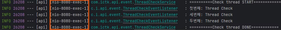 Spring Event는 이름이 “Event”여서 그런지 기본적으로 비동기식일 거라고 오해할 수 있다. 하지만 이벤트를 발행하는 스레드와 소비하는 스레드의 로그를 확인하면 동일한 스레드 하에서 동기식으로 동작하는 것을 볼 수 있다.