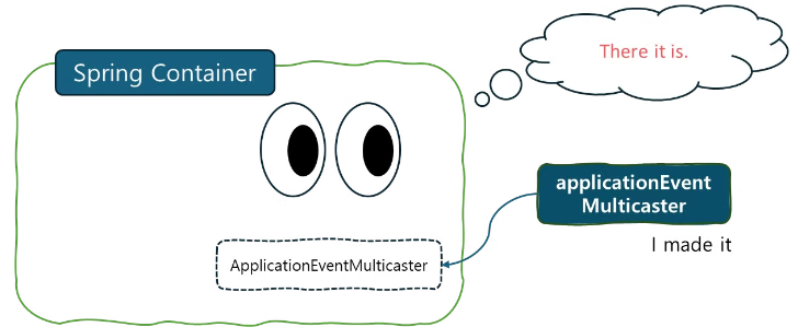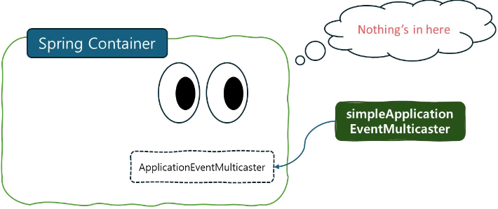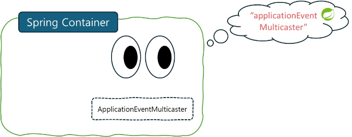 Spring Container에서는 ApplicationEventMulticaster을 만들 때, applicationEventMulticaster라는 “이름”의 빈을 찾는데, 만약 사용자가 이를 커스터마이징하지 않았다면, Spring Container는 기본적으로 SimpleApplicationEventMulticaster를 사용해 자동으로 빈을 등록한다.