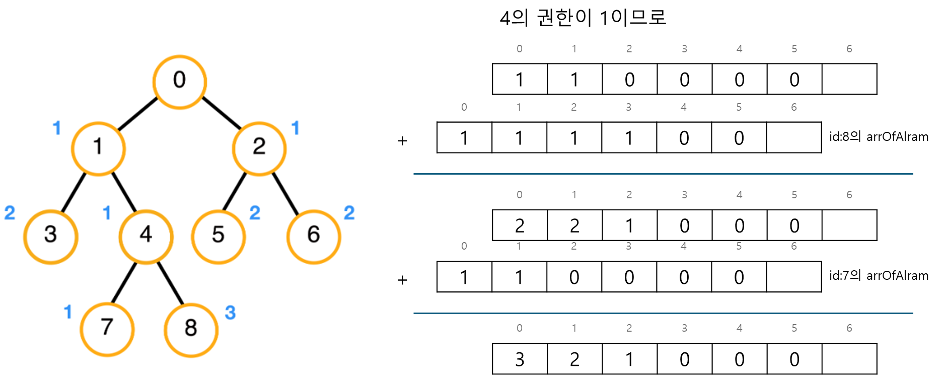 위 배열에서 id:8 노드의 arrOfAlram[2]의 값은 8노드 기준 두번째 상위 노드까지 본인의 알람을 전달할 수 있다는 의미가 된다.