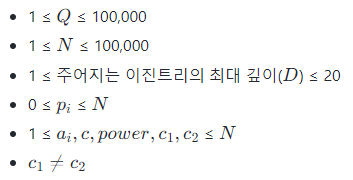 상당히 난이도가 있는 문제였다. 몇가지 더 언급하고 마무리해보자. 왜 내 원래 코드는 시간 초과가 났을까? 기존의 코드에서는 500번 명령어에서 트리의 순회로 직접 depth와 authority를 비교하는 계산을 수행하였다. 자, 인풋 사이즈를 보자.
