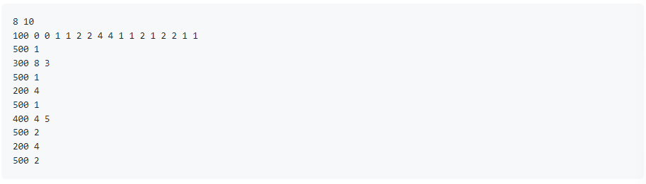 - 100 p1 p2 ... pN a1 a2 .... aN 형태로 공백을 사이에 두고 주어집니다. 1번부터 번까지 각 채팅방의 부모 채팅방 번호가 순서대로 부터 까지고, 초기 권한 세기가 각각 부터 까지임을 뜻합니다. 이 명령은 항상 첫 번째 명령으로만 주어지며, 항상 주어집니다. 0번 채팅방의 값과 값은 주어지지 않음에 유의합니다.
