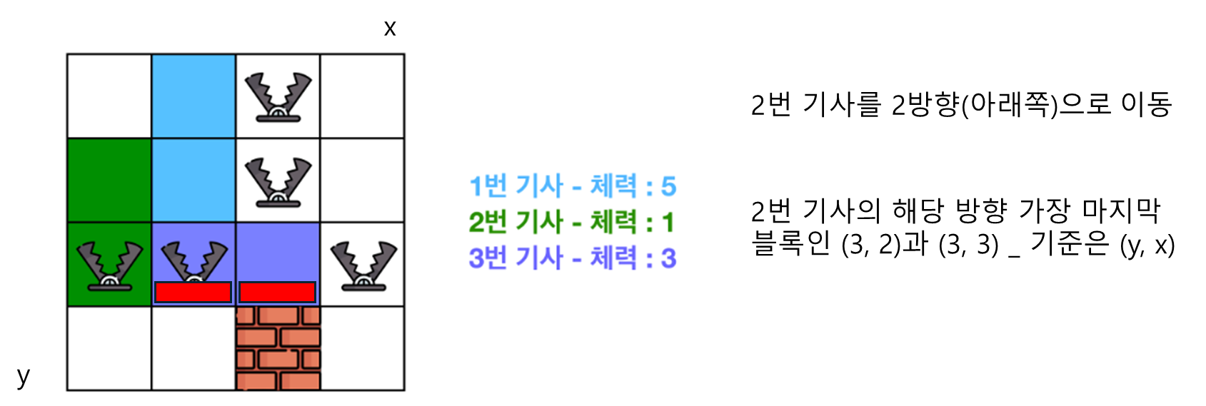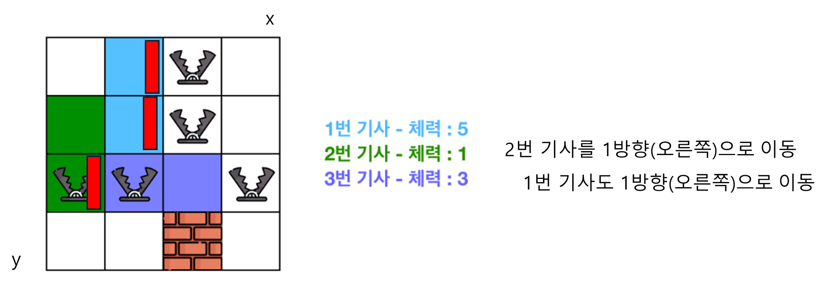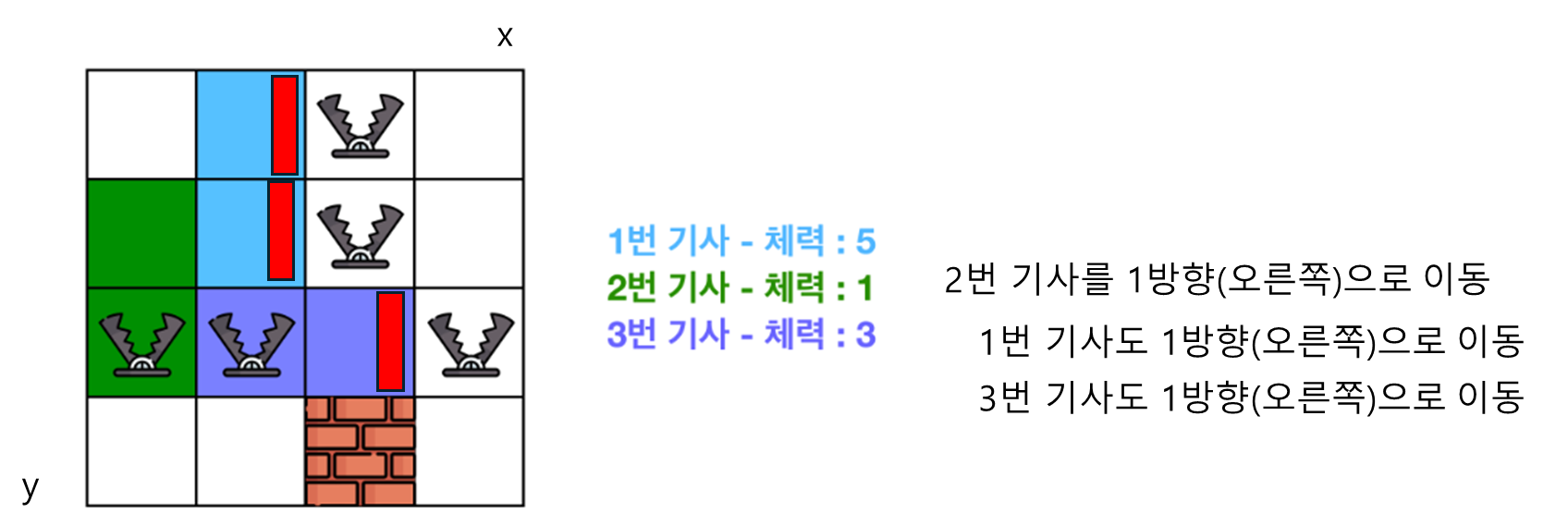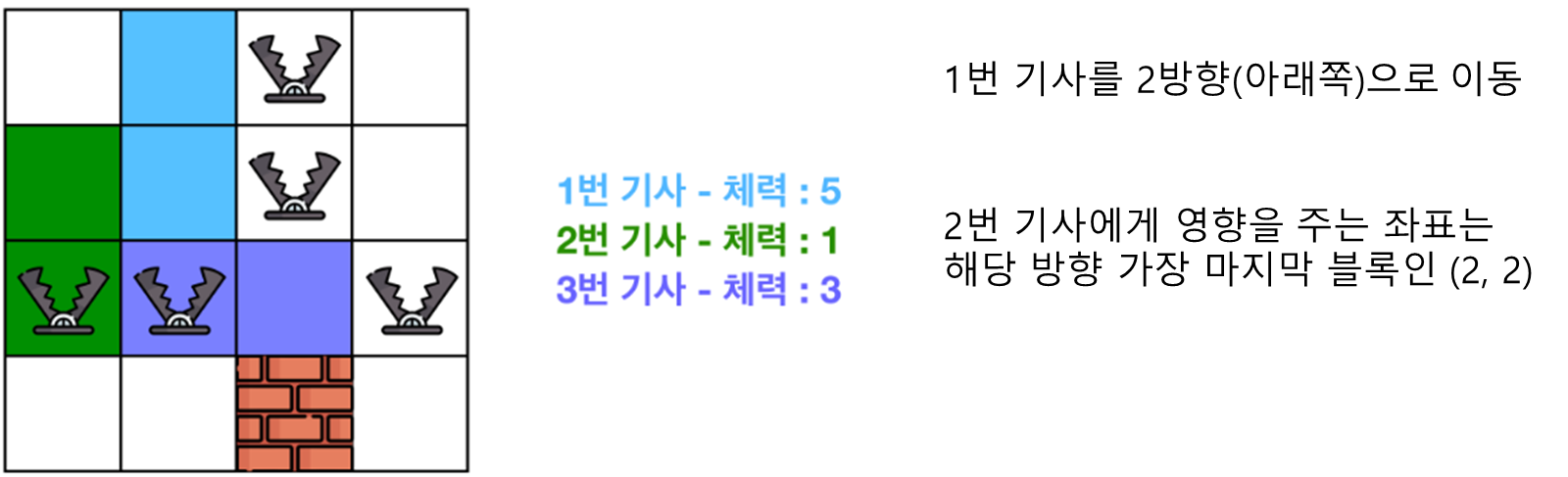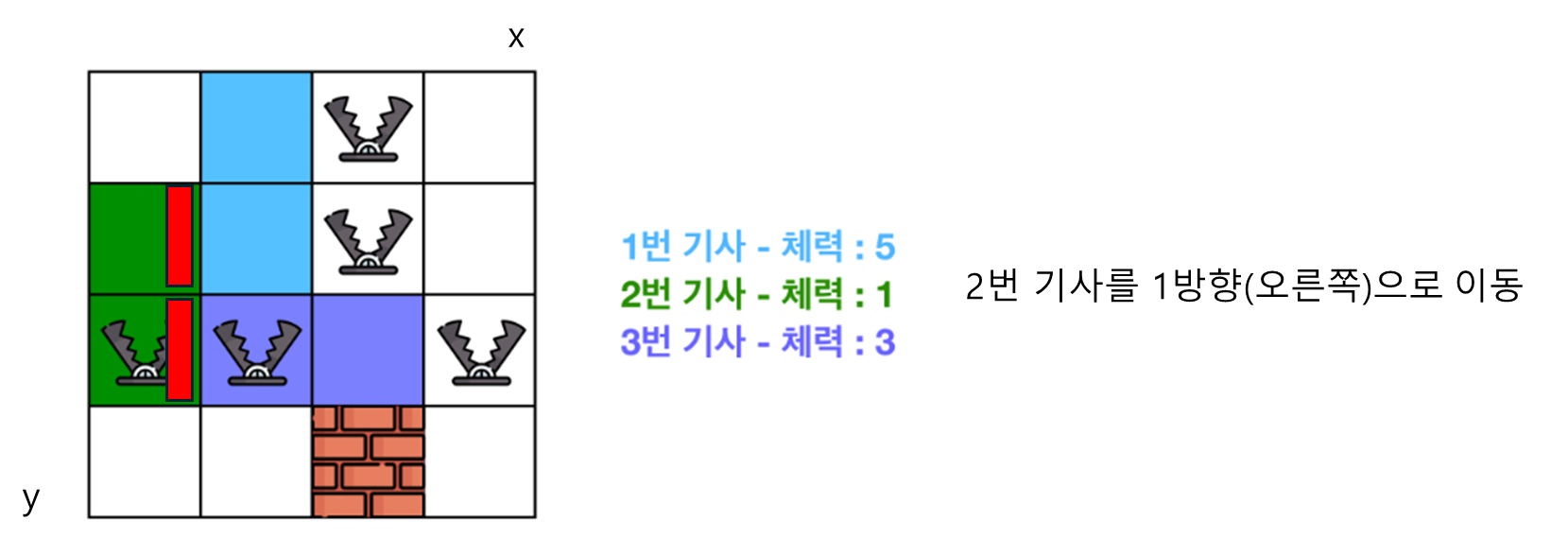 (2) 대결 대미지 : 명령을 받은 기사가 다른 기사를 밀치게 되면, 밀려난 기사들은 피해를 입게 됩니다. 이때 각 기사들은 해당 기사가 이동한 곳에서 직사각형 내에 놓여 있는 함정의 수만큼만 피해를 입게 됩니다. 각 기사마다 피해를 받은 만큼 체력이 깎이게 되며, 현재 체력 이상의 대미지를 받을 경우 기사는 체스판에서 사라지게 됩니다.