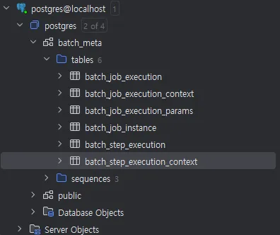 다만 script를 자동으로 실행하게 되면 한가지 문제점이 발생한다. 바로 public schema에 batch meta data table이 생성된다는 점이다. public에 서비스 운영에 관련된 데이터들도 들어갈텐데 schema가 상당히 지저분해진다.