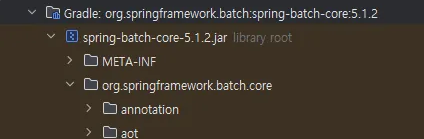IntelliJ 기준으로 External Libraries를 열어보자. 의존성으로 등록한 라이브러리들이 위치한 곳인데 여기서 스크롤을 조금 내리다 보면 Gradle: org.springframework.batch:spring-batch-core:5.1.2라이브러리를 확인할 수 있을 것이다. 라이브러리를 열고 다시 스크롤을 조금만 내리면 schema-*.sql 파일을 확인할 수 있을 것이다.