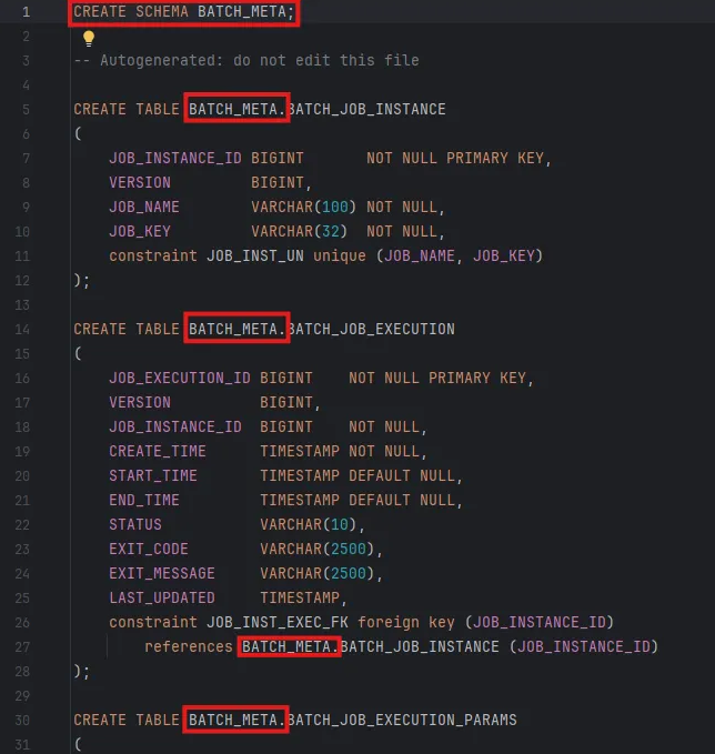 - 업그레이드와 호환성 관리: Spring Batch 4.x에서 5.x 버전으로 버전이 올라갈 때, DB 스키마도 상당히 많이 변하였다(Spring batch 5.0 Migration Guide - 국문 번역). 이처럼 자동 생성에 의존하면, 배포 시 예상치 못한 스키마 변경이 발생하여 기존 데이터와의 호환성 문제가 생길 수 있다. 수동 스크립트 관리를 통해, 필요할 경우 변경 사항을 사전에 검토하고, 데이터 마이그레이션 등을 준비할 수 있을 것이다.