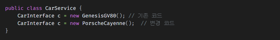 위 코드처럼 GV80을 카이엔으로 변경하는 과정에서 무조건 소스코드의 변경이 일어난다. 분명히 다형성을 사용했지만 OCP 원칙을 고수할 수 없다. 따라서, 객체를 생성하고 연관관계를 맺어주는 별도의 설정자가 필요하다. 이 작업은 java 코드에서 주로 Spring이 도맡는다.
