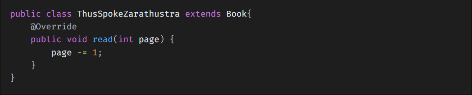 니체의 명도서 "차라투스트라는 이렇게 말했다" 클래스는 Book 클래스를 상속하였고 read()라는 메서드를 오버라이딩하였다. 하지만 이 책은 너무나 난해한 나머지 read() 메서드를 실행하면 page가 1씩 감소한다.