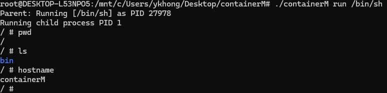 $ sudo ./containerM run /bin/sh