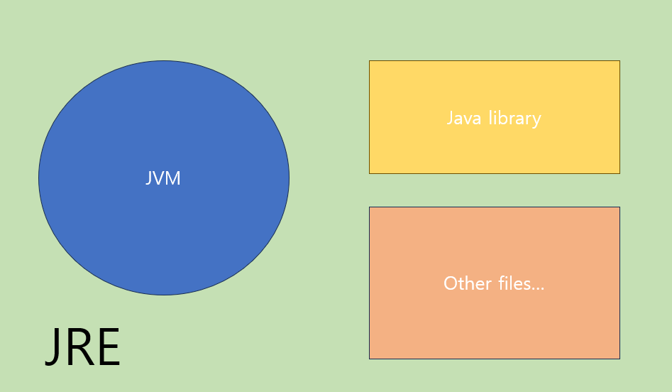 JRE : Java Runtime Environment의 약자로, 직역하자면 자바 실행 환경이다. Java Virtual Machine이라 불리는 JVM와 자바 실행에 필요한 클래스 라이브러리 등을 포함하고 있어 JRE를 통해서 자바 실행을 지원받을 수 있다.