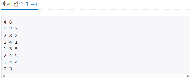 첫째 줄에 정점의 개수 N과 간선의 개수 E가 주어진다. (2 ≤ N ≤ 800, 0 ≤ E ≤ 200,000) 둘째 줄부터 E개의 줄에 걸쳐서 세 개의 정수 a, b, c가 주어지는데, a번 정점에서 b번 정점까지 양방향 길이 존재하며, 그 거리가 c라는 뜻이다. (1 ≤ c ≤ 1,000) 다음 줄에는 반드시 거쳐야 하는 두 개의 서로 다른 정점 번호 v1과 v2가 주어진다. (v1 ≠ v2, v1 ≠ N, v2 ≠ 1) 임의의 두 정점 u와 v사이에는 간선이 최대 1개 존재한다.