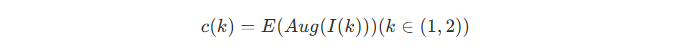 Two inputs I(1) and I(2) are first augmented Aug()*, then passed through the encoder E to obtain latent codes(embedding) c(k) ∈ R^n.
