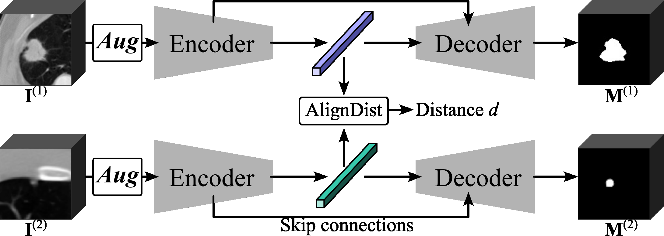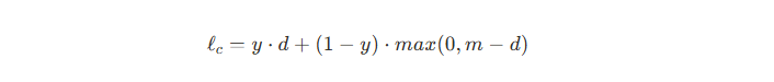 y is the label whether two input image belong the same class (benign/malignant), 0 otherwise, m is the margin hyper parameter that enforces a minimum separation for negative pairs. The distance d can be obtained by the ‘AlignDist’ module which is defined below🔽. If y = 1 (I mean positive pair), ℓc is d. Loss decreases if distance is small. If y = 0 (I mean negative pair), ℓc is max(0, m - d). Penalty only if d < m. If already beyond margin, no further push.
