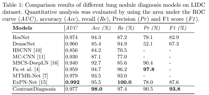 The model was trained using the L2 (Euclidean) distance metric, with the loss weight ω set to 1.5. Optimization was performed with the Adam optimizer, an initial learning rate of 0.001, and Stochastic Gradient Descent with Warm Restarts(SGDR) for scheduling. For comparison, the diagnosis accuracy of ContrastDiagnosis was benchmarked against several traditional supervised lung nodule classification methods, showing competitive performance across metrics.