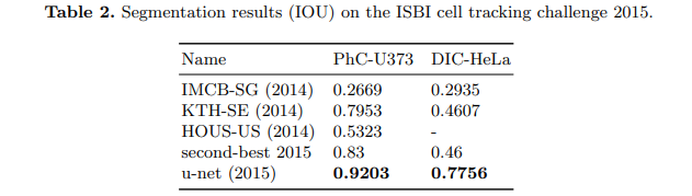 이어서 ISBI cell tracking challenge(PhC-U373, DIC-HeLa 데이터셋)에서도 매우 적은 수의 부분 라벨 이미지(35장, 20장)만으로 학습하여 IoU 92.0%, 77.5%를 달성하며 기존 2위 대비 큰 격차로 1위를 차지한다.