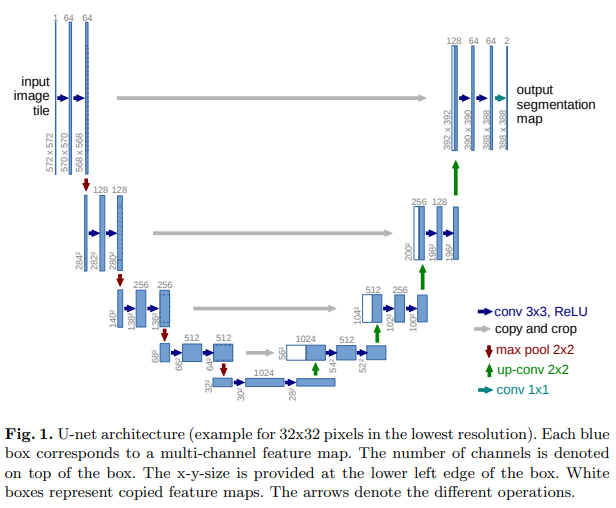 구조 측면(Fig. 1.)에서 U-Net은 왼쪽의 수축 경로에서 conv + max pool을 반복해 점점 넓은 receptive field와 풍부한 컨텍스트를 얻고, 오른쪽의 확장 경로에서 up-conv(2x2)로 해상도를 복구하면서 conv로 세밀한 feature를 다시 정제한다. 이때 단순히 업샘플링만 하는 것이 아니라 같은 해상도의 인코더 feature map을 잘라서 채널 방향으로 concat한다. 이렇게 하면 DeconvNet처럼 pooling index만 되살리는 수준을 넘어, 경계/텍스처 같은 로컬 정보 전체를 직접 재사용하게 된다.