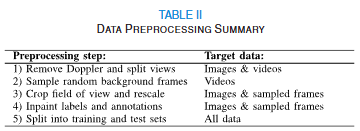 전처리에서는 Doppler overlay 제거, split view 제거, Telea inpainting을 이용한 소노그래퍼의 주석 제거, 224x288 크롭, 표준화(normalization)를 적용했다. 이어 extreme class imbalance를 처리하기 위해 표준 스캔면 + background로 구성된 balanced mini-batch을 도입하여 13개 표준면 x 2장 + background 26장으로 구성해 구조적으로 균형있는 학습이 가능하도록 설계했다.