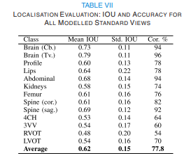 약지도 localisation 평가는 총 650장의 이미지(13개 스캔면 x 50장)를 대상으로 bounding box GT를 수동으로 구축해 비교하는 방식으로 수행되었다. 평가는 객체 검출 분야 표준 지표인 IoU ≥ 0.5 기준으로 측정되었다. 그 결과 SonoNet-32는 전체 평균 77.8% accuracy를 기록했다. 심장(view)에서는 62%로 다소 낮았으나 나머지 표준 스캔면에서는 평균 84.9%로 매우 안정적인 위치추정 성능을 보였다.