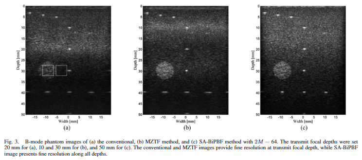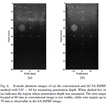 팬텀 실험에는 CIRS Model 040 다조직 팬텀이 사용되었으며 내부에는 와이어 타깃, 무에코 실린더, 그레이스케일 타깃이 포함되어 있다. 영상 성능 비교는 아래 세 가지 빔포밍 방식 간에 이루어졌다. (1) Conventional B-mode (2) Multizone Transmit Focusing(MZTF) (3) SA-BiPBF (2M=64)