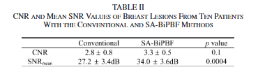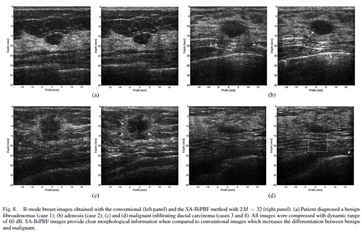 이 논문에서의 기여는 이런한 SA-BiPBF 구조를 팬텀 실험과 실제 유방 병변 환자 영상에 동시에 적용하고, 단순한 물리적 지표(SNR, CNR, 해상도, penentration depth 등)뿐 아니라 방사선과 전문의의 블라인드 판독 및 BI-RADS 평가를 통해 임상적 해석의 변화를 분석했다는 점이다. 다시 말해, 이 연구는 SA-BiPBF를 이론적으로 좋은 방법이 아니라, 임상 진단의 관점에서 장점과 한계를 동시에 드러내는 기술로 재정의함에 중요성이 있다.