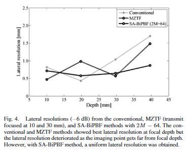 Conventional 및 MZTF 방식은 송신 초점 근처에서 우수한 해상도를 보였으나 초점에서 멀어질수록 해상도가 급격히 저하되는 경향을 보였다. 반면 SA-BiPBF는 전 깊이에 걸쳐 균일한 측방 해상도를 유지하였다. 특히 40mm 깊이에서는 conventional 대비 약 95%의 해상도 개선이 관찰되었다. 다만 near-field 영역에서는 위상 보상이 완전하지 않아 SA-BiPBF의 해상도가 다소 열화되는 현상도 함께 보였다(Fig. 3, Fig. 4.).
