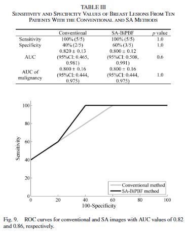 다만 모든 변화가 긍정적으로 해석되지는 않았다. 예를 들어, 강한 반사체(뼈) 인근에서는 반사 아티팩트가 오히려 강조되거나, 일부 경우에서는 기존에 악성 지표로 활용되던 edge shadowing 아티팩트가 감소하여 판독 기준에 혼선을 줄 가능성도 지적되었다. BI-RADS 및 ROC 분석에서도 SA-BiPBF가 다소 높은 AUC를 보였으나 표본 수가 제한적이어서 통계적 유의성은 확보되지 않았다.