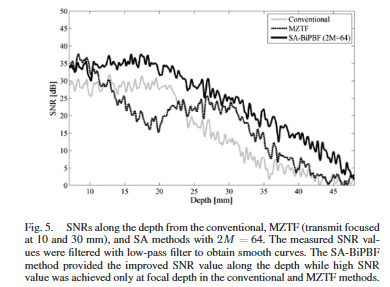 기존 B-mode 영상에서는 송신 초점이 팬텀 실험의 경우 20mm, in vivo 실험에서는 병변 위치에 따라 10~15mm로 조절되었다. 반면 SA-BiPBF의 경우 합성 가능한 subaperture의 수를 최대화하기 위해 송신 초점을 영상 영역의 제일 끝 또는 외부(phantom의 경우 50mm, in vivo의 경우 40mm)에 위치시켰다. 이는 SA-BiPBF의 구조적 특성을 반영한 설정으로, 전 깊이에서의 합성 효과를 극대화하기 위함이다.