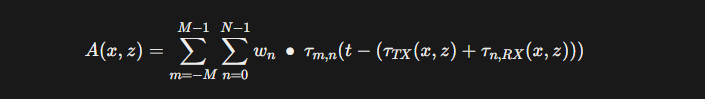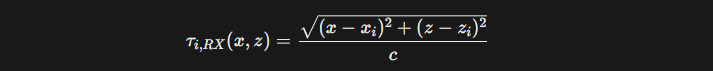 수신 단계에서는 기존의 동적 수신 집속과 동일하게, 각 수신 소자 위치와 픽셀 간의 거리를 기반으로 수신 지연을 계산한다. 동일한 영상 픽셀(x, z)에 대한 i번쨰 소자(xi, zi)의 수신 포커싱 지연은 다음과 같이 계산될 수 있다.