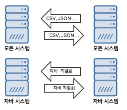 자바에서 사용하는 Serialize는 자바 시스템 내에서 활용하기 위해 만들어진 기술이다. 그럼 자바 시스템 간에서는 CSV나 JSON, XML 등을 이용해서 데이터를 전송하지 않는 것인가는 물음을 다시 던진다면 그 또한 틀렸다.