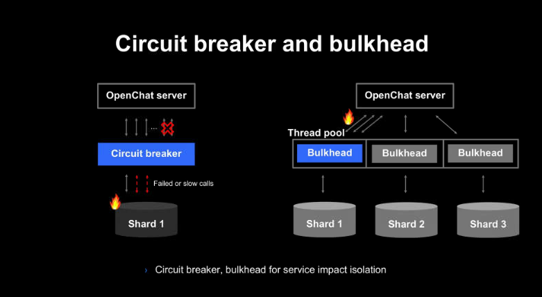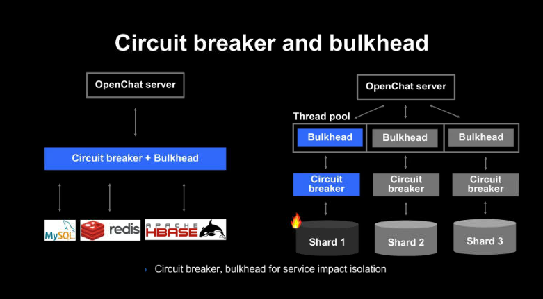 핫 챗 때문에 스토리지의 한 샤드의 처리 속도가 느려지거나 사용불능이 되더라도 다른 샤드로 가는 요청은 영향받지 않고 처리되도록 서킷 브레이커와 벌크헤드(bulkhead)를 도입하였다.