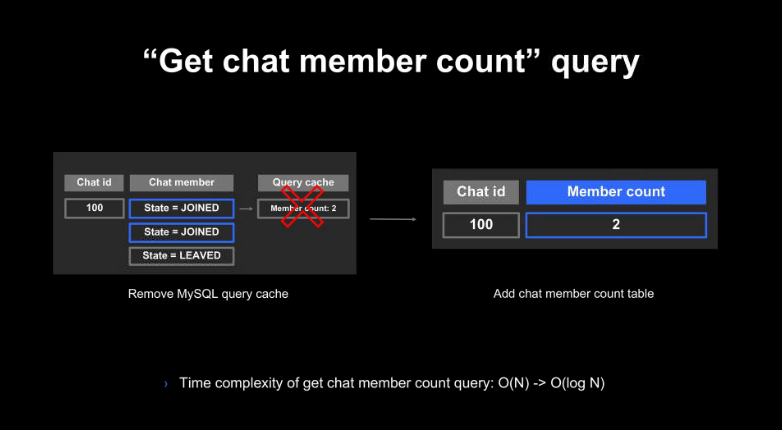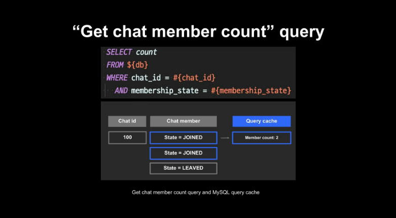 하지만 1초에 2천 개 이상의 오픈챗 참여 요청이 몰리자 문제가 발생했다. 참여하고 있는 멤버 수를 캐싱하고 있는 MySQL 쿼리 캐시가 참여 요청 하나를 처리할 때마다 멤버 수 값을 갱신했는데 이 때 테이블 락을 잡고 멤버수를 재계산하며 쿼리 캐시를 갱신하기 때문에 MySQL에 큰 부하가 발생하였다.