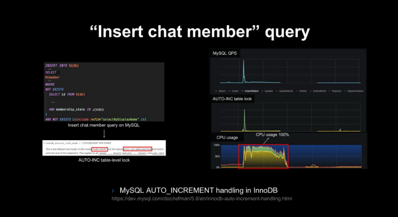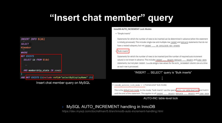 이와 같은 서브 쿼리는 간단한 INSERT 쿼리와는 달리 MySQL에서 벌크 INSERT 구문으로 취급한다. 이때 MySQL의 innodb_autoinc_lock_mode가 기본값이 1이라면 벌크 INSERT 구문은 AUTO-INCREMENT 값을 증가시키기 위해 테이블 락을 잡는다. 오픈챗 서버에서는 MySQL의 AUTO-INCREMENT 락(lock) 모델을 기본값(1)으로 사용하고 있기 때문에 한 오픈챗에 참여 요청이 급증하면 AUTO_INCREMENT 테이블 락 경합도 같이 급증하게 되는 구조이다.