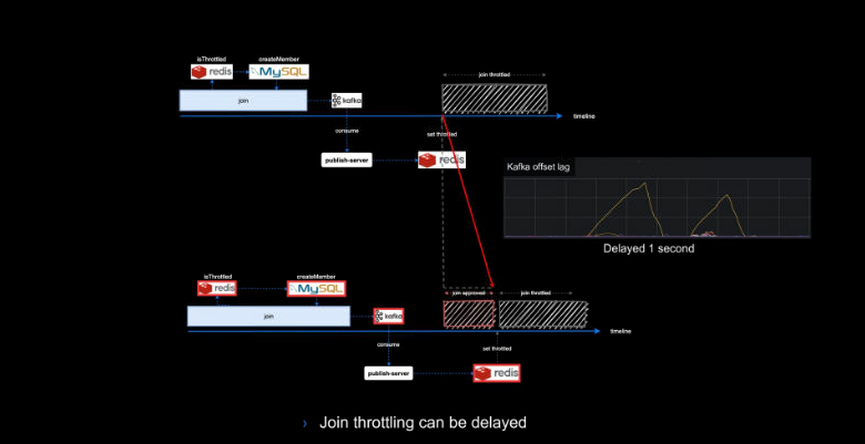 Kafka를 사용하는 조인 스로틀링은 항상 몇 초 정도의 지연이 발생할 수 있다. 참여 요청 완료 후 Kafka를 통해 퍼블리시 서버로 참여 완료 이벤트를 전달하려면 Redis와 MySQL, Kafka 등 거쳐야 할 스토리지가 많다. 이때 특히 Kafka는 핫 챗 때문에 특정 파티션의 오프셋 랙이 순간적으로 증가해 몇 초 정도의 처리 지연이 발생할 수 있다. 즉, 퍼블리시 서버 앞단에서 지연이 발생하면 조인 스로틀링도 그만큼 지연되는 구조인 것이다.