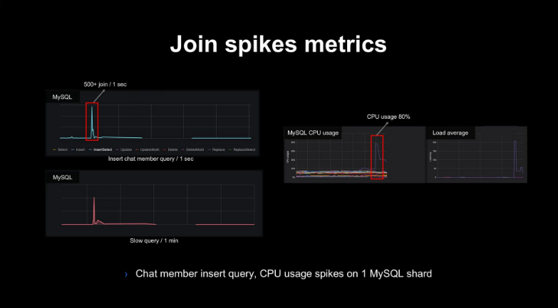 오픈챗 서버는 오픈챗 참여 요청이 오면 챗 멤버 데이터를 MySQL에 저장한다. 라인은 오픈챗 참여 요청이 한 챗에 몰리자 특히 MySQL 부하가 급증하는 것을 확인하였다. 1초에 2천개 이상의 오픈챗 참여 요청이 한 챗에서 발생했을 때의 지표가 아래 사진에 나와있다. MySQL 1개 샤드에 INSERT 쿼리가 순간적으로 몰리고 느린 쿼리와 CPU 사용량이 급증하는 것을 확인할 수 있다.