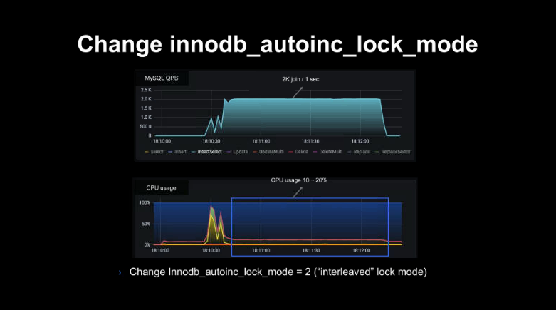 실제로 한 오픈챗에 참여 요청이 몰렸을 때 MySQL 지표를 확인해 보면 AUTO_INCREMENT 테이블 락을 잡기 위한 경합이 굉장히 많았고 이 때문에 MySQL의 CPU 사용률이 100%에 도달해 응답 타임아웃이 발생하는 것을 확인할 수 있었다.