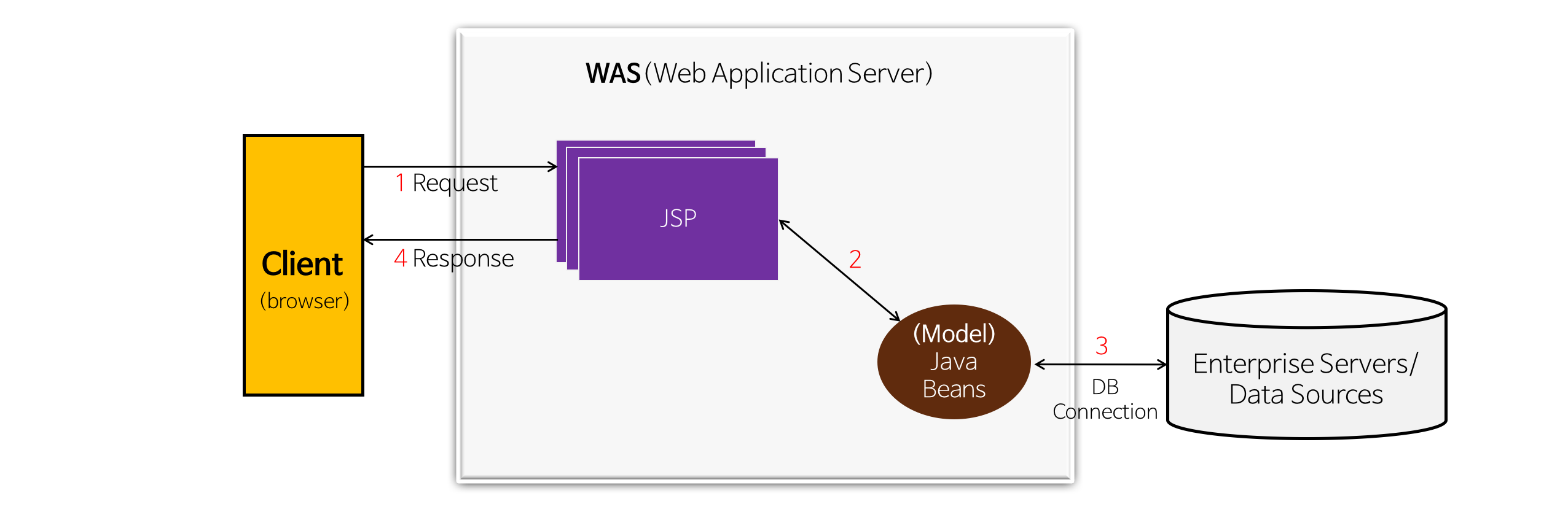 초기에는 웹 애플리케이션 개발에 Servlet만을 사용하였고 이후 JSP 기술이 발표되면서 JSP 형태의 개발이 유행하게 되었다. 아래는 JSP를 활용한 기본적인 구조(JSP Model 1)이다.