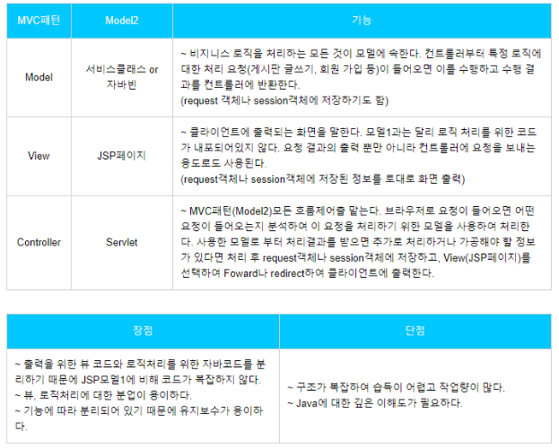 위 구조로 Presentation 로직(View)과 Business 로직(Model)을 분리할 수 있게 되었다. View(화면을 뿌리는 영역)에는 HTML 베이스의 JSP를 활용하고 Controller(다른 JAVA 클래스에 데이터를 넘기는 영역)는 JAVA 베이스의 Servlet을 활용, Model(서비스 로직이 돌아가는 영역)은 Java Beans로, DTO, DAO를 통해 Data Storage에 접근하는 역할의 분업화가 일어났고 이로써 MVC 패턴이 완성되었다.