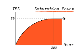 유저 수에 따라 TPS는 지속해서 증가하다가 더 이상 증가하지 않고 유지되는 시점을 Saturation Point(포화 지점)라고 한다. 만약 이 지점을 지난후에 TPS가 떨어지게 된다면 튜닝이 필요한 시스템을 의미하게 된다. 포화지점은 '초당 처리할 수 있는 Transaction의 수가 한계에 도달했고 그때부터 사용자가 증가하면 Latency가 증가한다는 것'을 의미하므로 포화지점이 해당 서버가 감당할 수 있는 한계 지점을 의미한다.