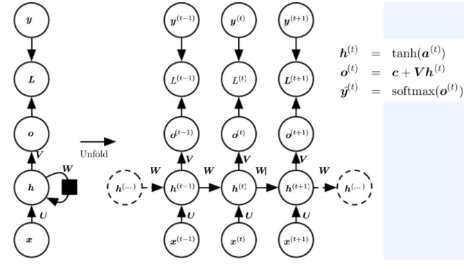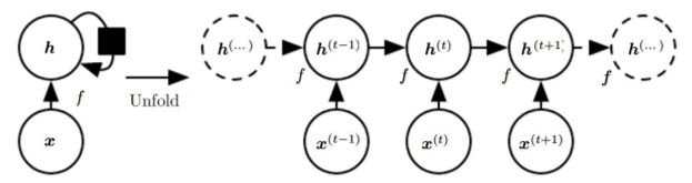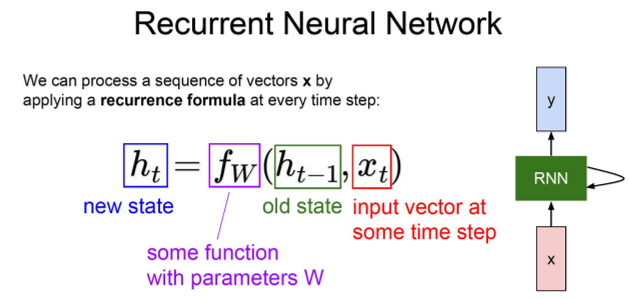 이전 hiddent state를 가지고 현재 input vetor와 함께 function f에 집어 넣으면 새로운 state가 나오게 되는 구조이다. 여기서 매 스텝마다 parameters는 sharing되게 된다.