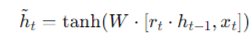 - h~t=tanh(W x [r_t x h{t−1},x_t]) 여기서 W는 새로운 메모리 내용을 계산하는 가중치