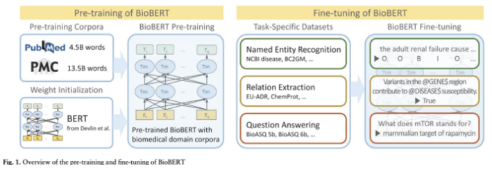 BERT라는 Transformer 모델을 기반으로 PubMed, PMC 등의 사이트에서 data를 가져와 Pretrained model을 만든다. 그 후 일반적으로 문제 해결을 위한 특별히 구축된 dataset(task-Specific Dataset)을 기반으로 Fine-tuning을 진행한다.