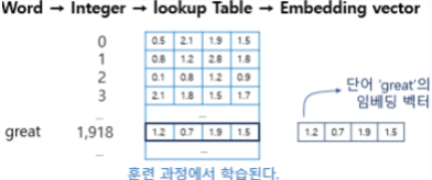 One-hot encoding의 경우 데이터 사이즈가 너무 크기 때문에 이를 vector화 하여 float 형태 데이터로 데이터 사이즈를 줄여 놓는 것을 Lookup table이라고 부른다.