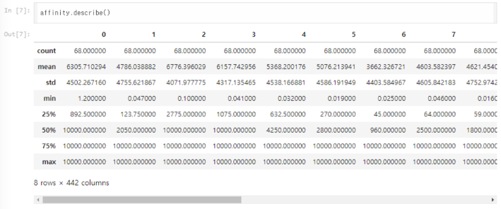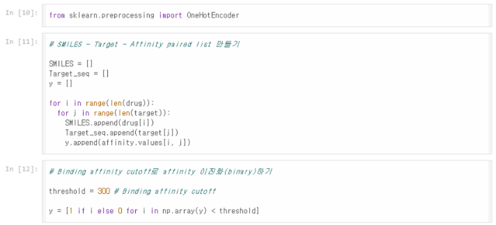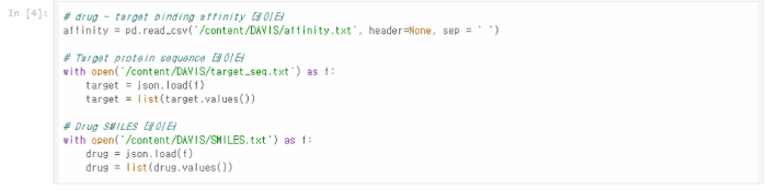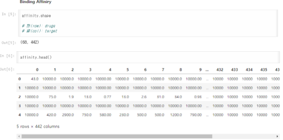 약물(또는 억제제)과 타겟 단백질 쌍을 만들고, 각각의 결합 친화도 값을 저장한다. 데이터셋에는 여러 약물(drug)과 타겟 단백질(target) 쌍이 존재하며, 각각의 결합 친화도(affinity) 정보가 들어있다. 이를 paired list( affinity.values[i, j] )로 만들어서 모델이 학습할 수 있는 형태로 변환할 것이다.
