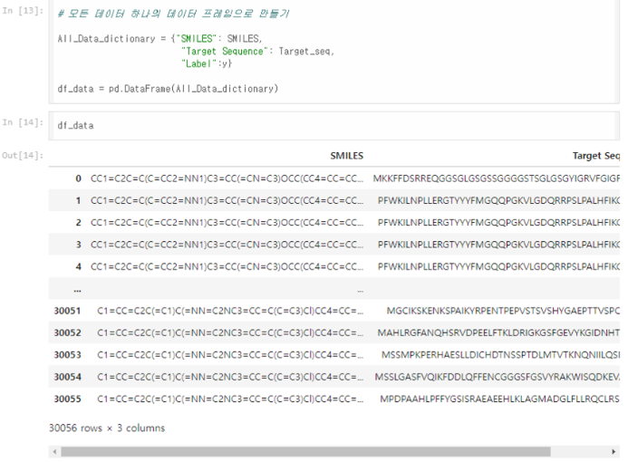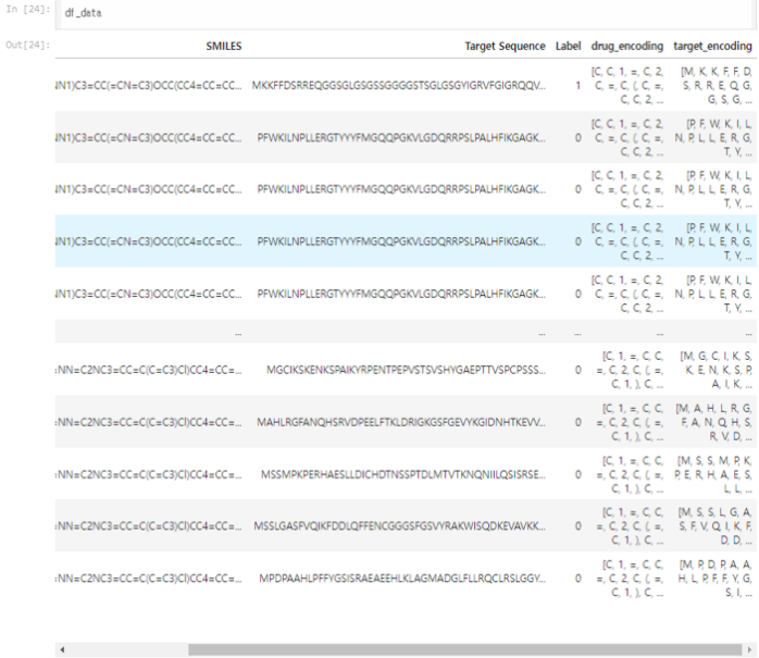 약물(SMILES), 타겟 단백질 서열(Target Sequence), 결합 여부(Label)를 하나의 데이터프레임으로 묶어 모델에 입력하기 위한 데이터를 준비한다. 약물의 SMILES sequence, Target portein sequence, 그리고 이진화된 결합 친화도(y)를 하나의 데이터 프레임으로 정리하고 모델 학습에 필요한 입력 데이터와 라벨을 일관성 있게 관리한다.