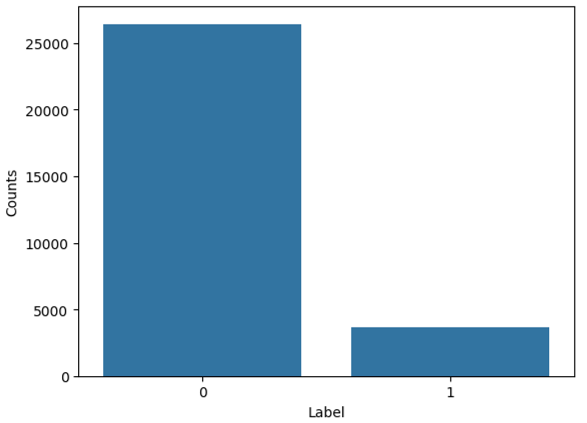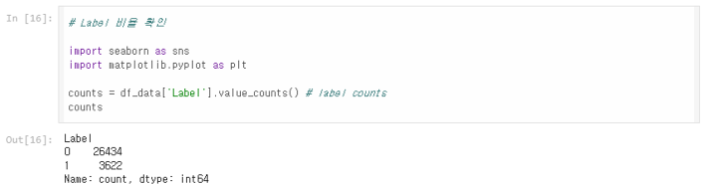 데이터 전처리에서 이진화한 결합 친화도(label)는 0(결합이 약함)이 26434건, 1(결합이 강함)이 3622건이다.