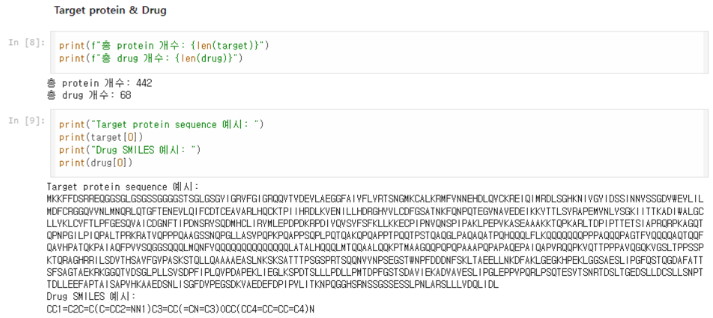 화학 물질(Drug)과 그 물질의 표적이 되는 단백질(Drug target) 사이의 상호작용(DTI) score를 예측함을 목표로 하고 실습을 진행해 보자.