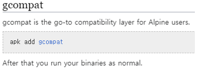 Alpine Linux에서도 musl과 glibc사이의 호환을 위한 방법들을 공식적으로 소개하고 있다(https://wiki.alpinelinux.org/wiki/Running_glibc_programs). 그중 하나가 gcompat이다.