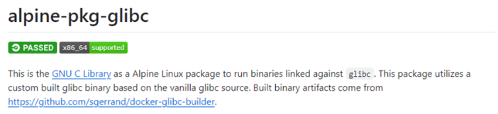 이 방법도 결과적으론 실패다. Github에서 오픈소스로 공개된 alpine linux 환경에서 glibc 라이브러리를 실행하기 위한 패키징을 발견했다.